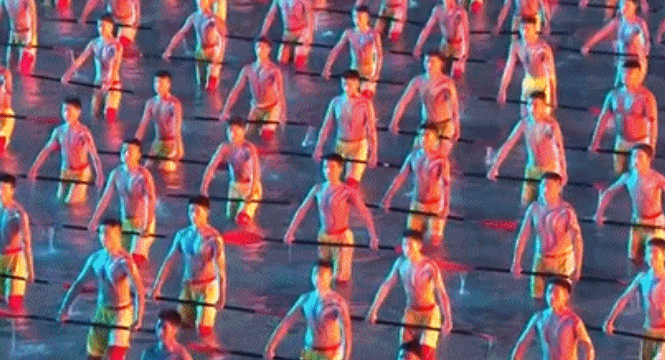 河南少林塔沟武术学校的225名青少年分成七人一组,组成了数座“人塔”。在不断升降的舞台上,在湿滑汹涌的海水中,他们创造了一艘载满罗汉的动感龙舟。